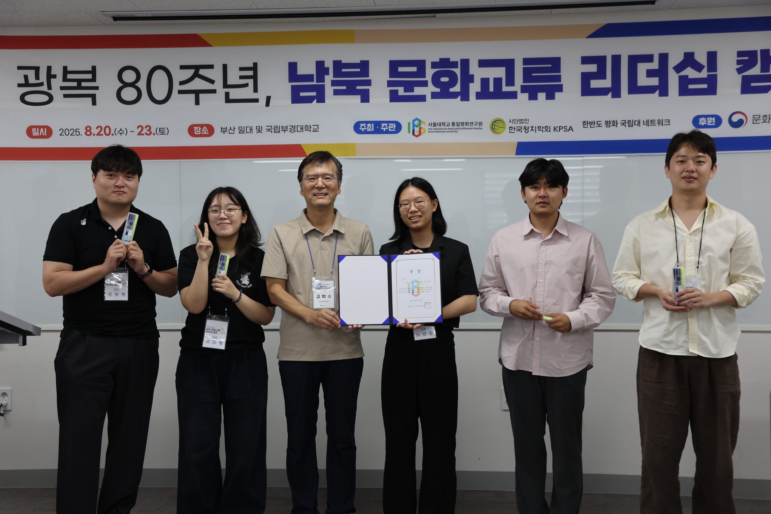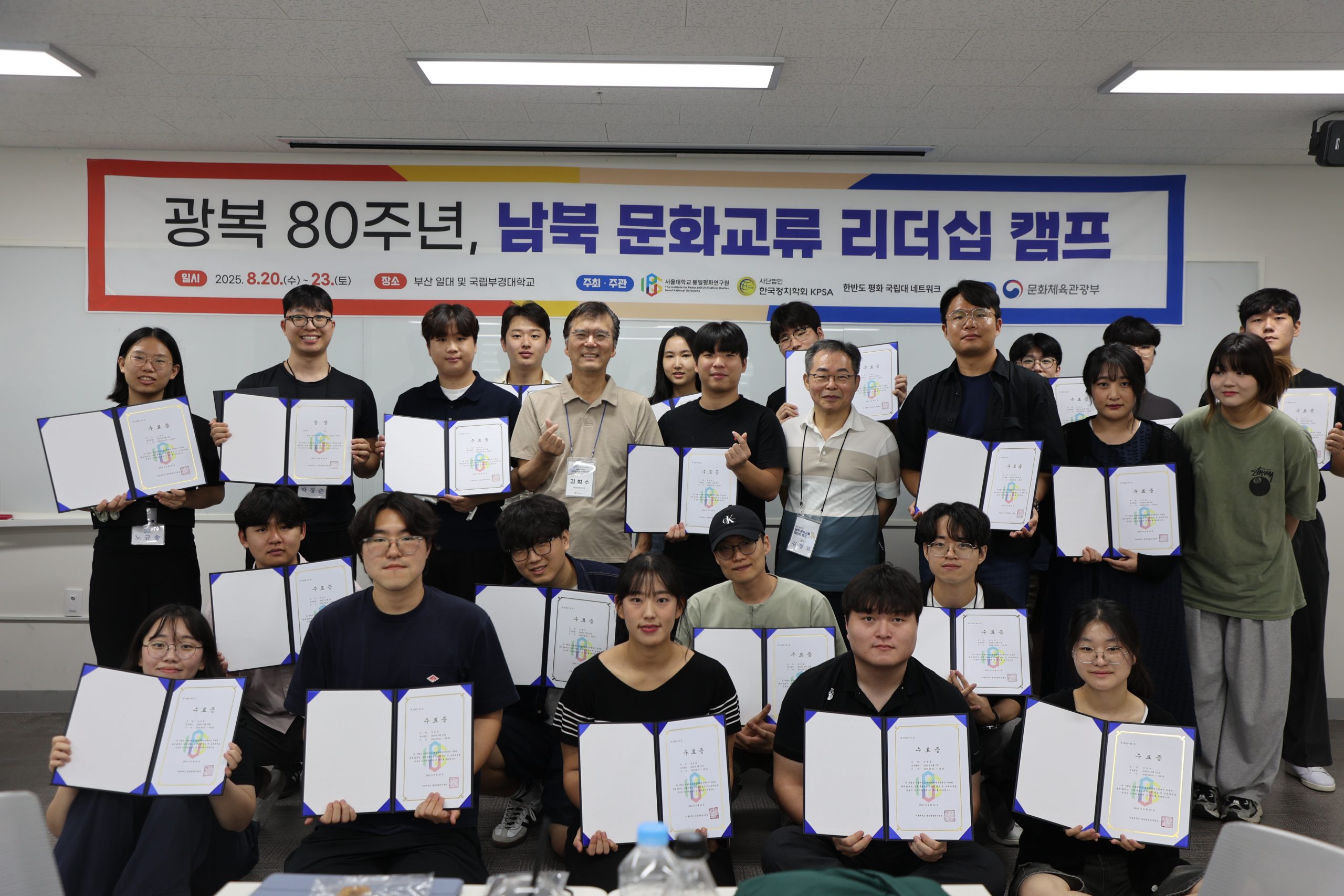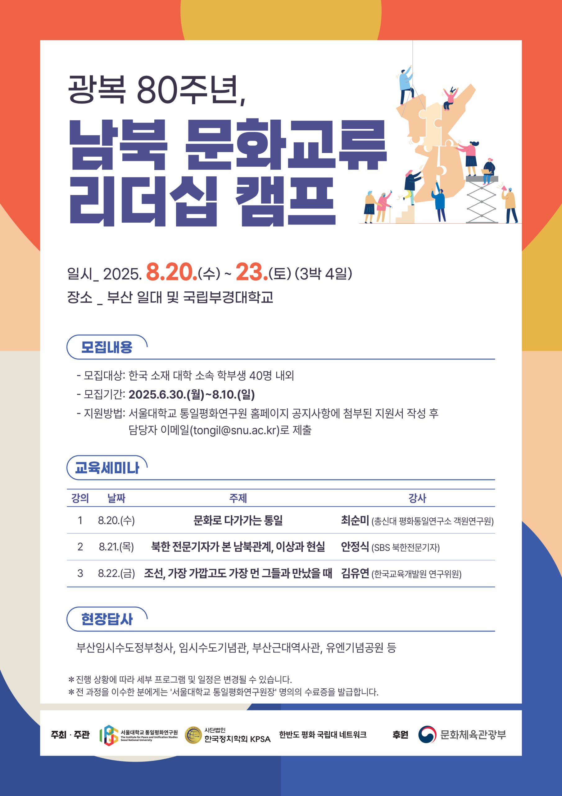 서울대학교 통일평화연구원과 한국정치학회, 한반도 평화 국립대 네트워크에서 공동주최하고, 문화체육관광부에서 후원한 이번 ‘남북 문화교류 리더십 캠프’는 대학 학부생을 대상으로 남북 문화교류 관련 교육 효과를 제고하기 위한 목적으로 8월 20일(수)부터 23일(토)까지 3박4일 동안 국립부경대학교에서 진행하였다. 서울대를 포함하여 국립강릉원주대, 전남대, 부산대 등 다양한 지역에서 참가한 총 30여명의 학생들은 이번 프로그램에서 3개의 남북 문화교류 관련 교육세미나를 수강하고, 광복 80주년을 맞이해 분단된 한반도를 돌아볼 수 있는 현장 교육 답사 등을 수행하면서 남북 문화교류의 과거와 현재를 진단하고 미래를 탐구할 수 있는 뜻깊은 시간을 가지게 되었다.