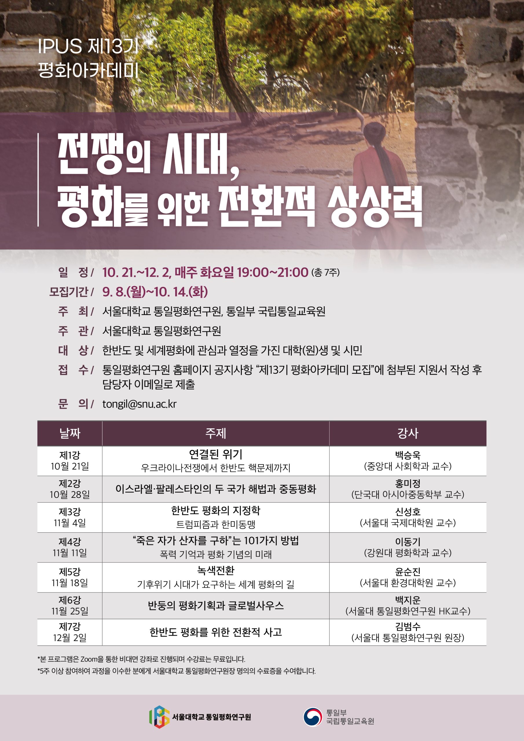 - 접수처 : 평화아카데미 담당자 이메일 (tongil@snu.ac.kr)