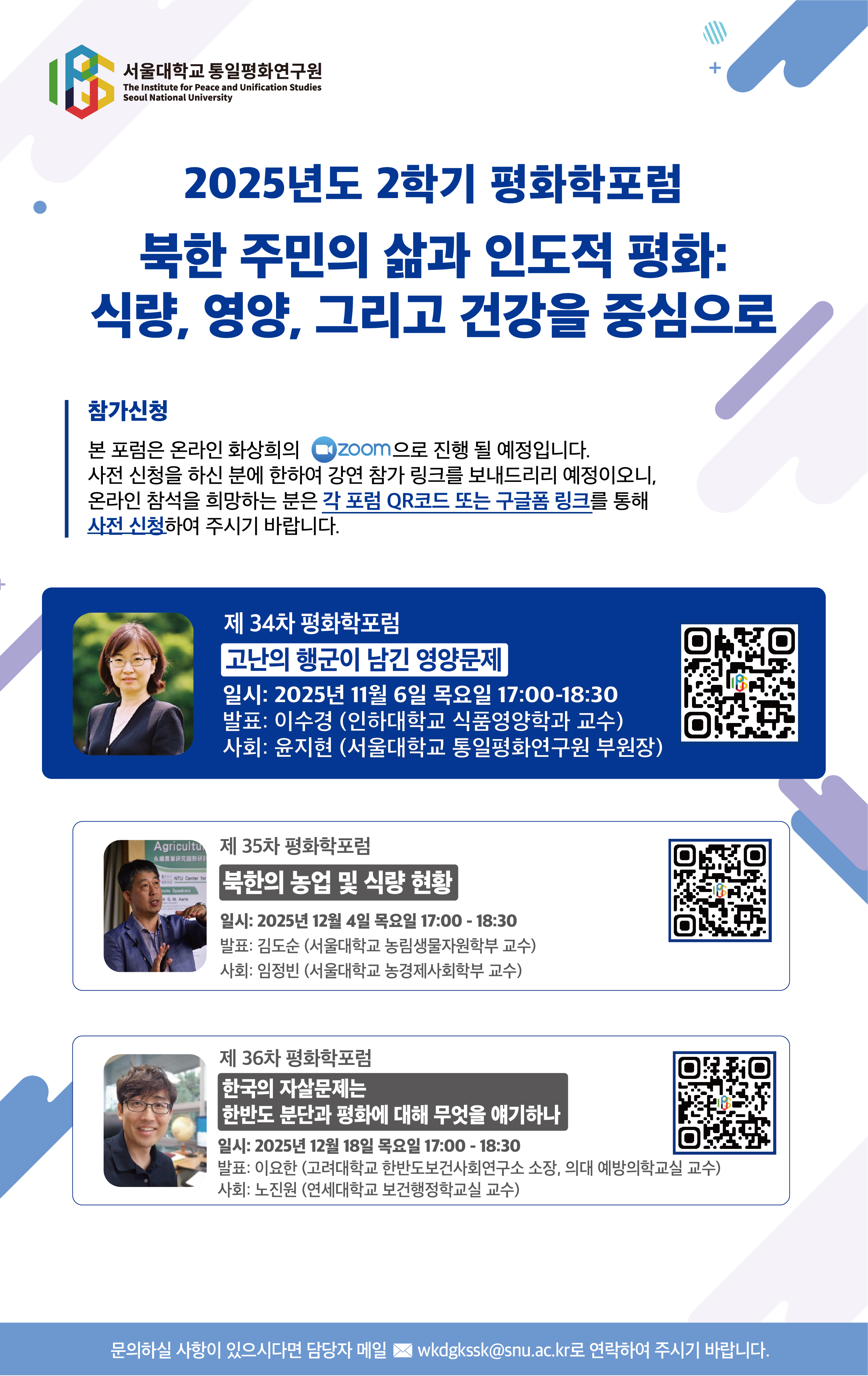 서울대학교 통일평화연구원은 [북한 주민의 삶과 인도적 평화: 식량, 영양, 그리고 건강을 중심으로]를 대주제로, 이수경 인하대학교 식품영양학과 교수를 모시고 <고난의 행군이 남긴 영양문제>를 주제로 한 제34차 평화학포럼을 개최합니다.