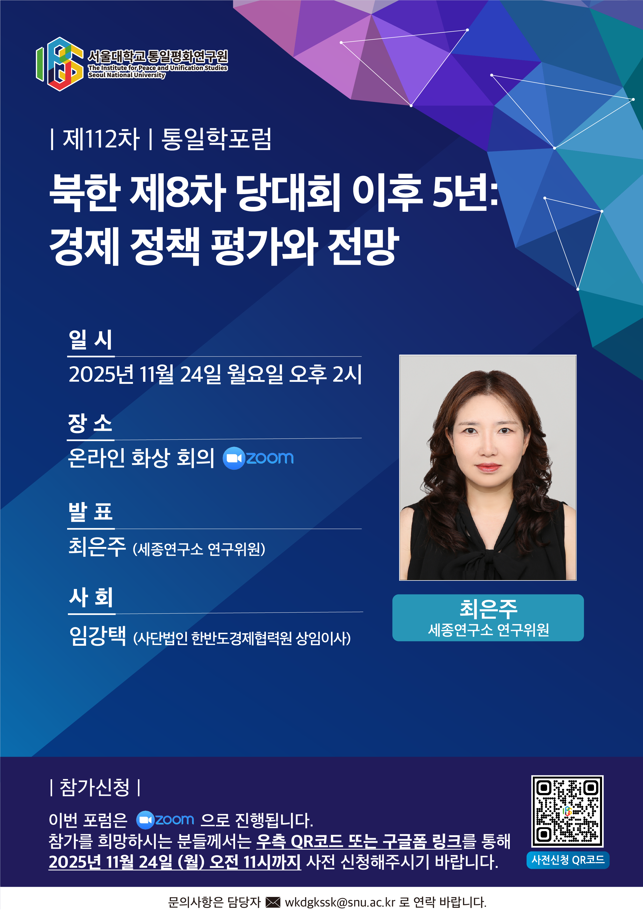 서울대학교 통일평화연구원에서 최은주 세종연구소 연구위원을 모시고 <북한 제8차 당대회 이후 5년: 경제 정책 평가와 전망>이라는 주제로 [제112차 통일학포럼]을 개최합니다.