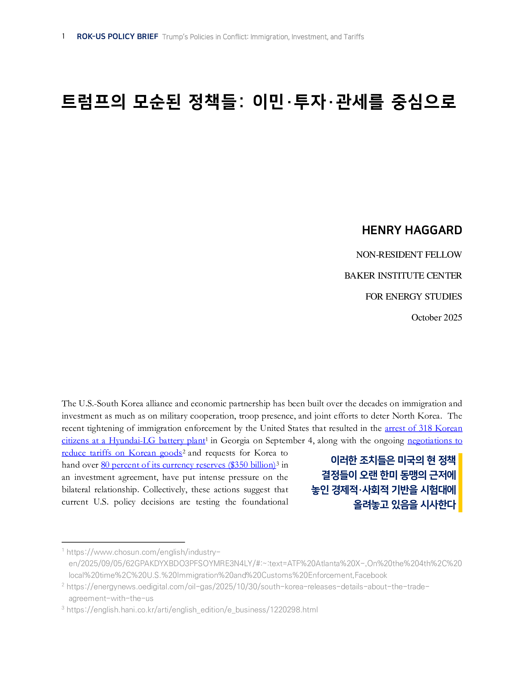 ROK-US POLICY BRIEF 14호(2025.10) – “Trump’s Policies in Conflict: Immigration, Investment, and Tariffs”_Henry Haggard