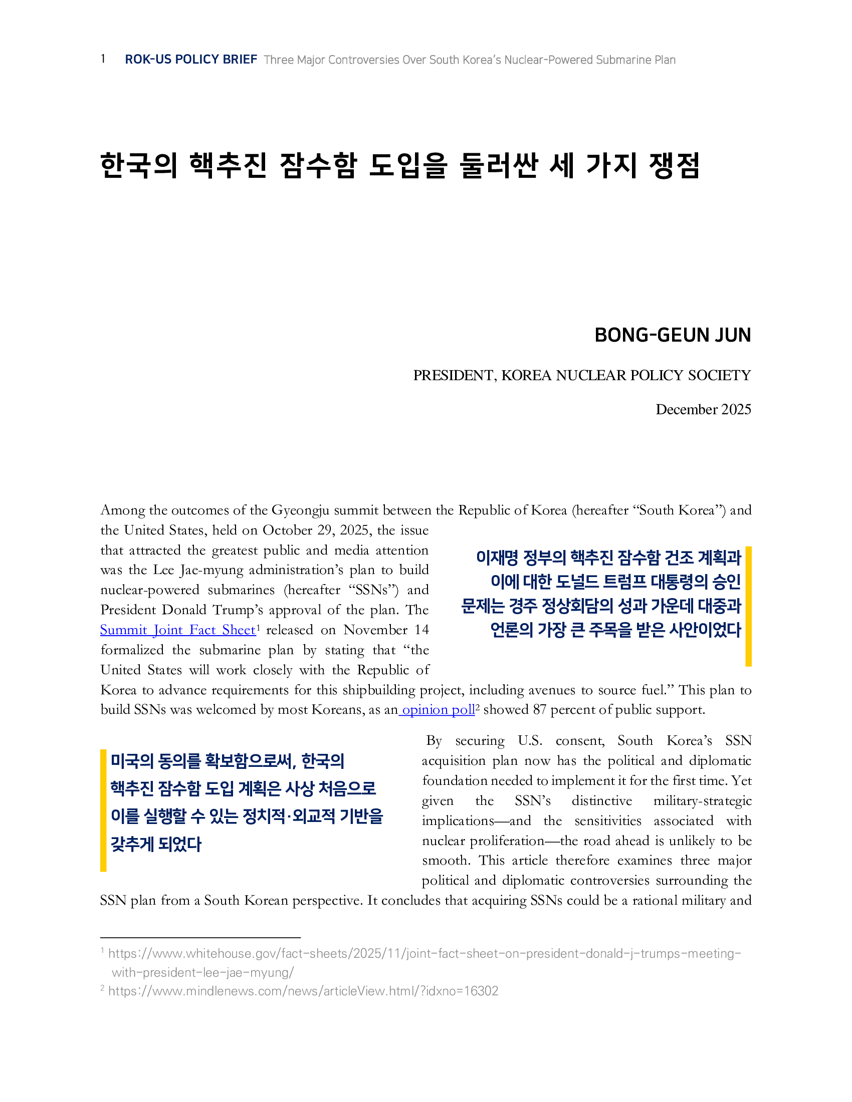 ROK-US POLICY BRIEF ISSUE 16호(2025.12) – “Three Major Controversies Over South Korea’s Nuclear-Powered Submarine Plan”_ Bong-geun Jun