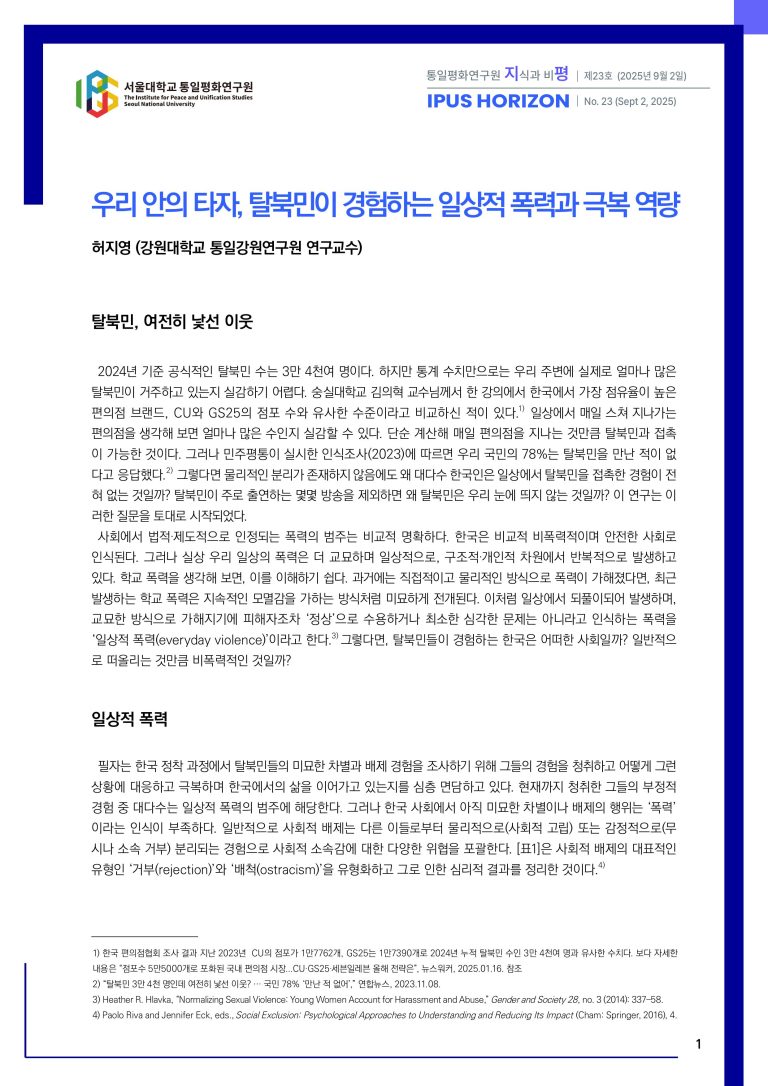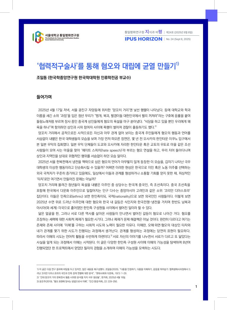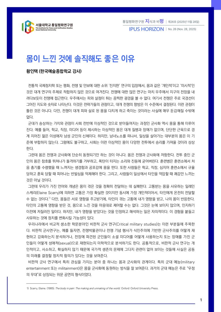 통일평화연구원 <지식과 비평(IPUS HORIZON)>은 다양한 분과학에서 진행되고 있는 연구를 평화학의 관점에서 새롭게 조망하고 한반도뿐 아니라 전 지구적 차원의 지속적 평화 문제에 관한 깊이 있는 논의를 제공하기 위한 장이다. <지식과 비평>은 인간, 사회, 국가, 환경 분야에서 평화 의제에 대한 지식을 탐구하고 오늘날 인류가 직면한 갈등과 위기에 대한 성찰을 바탕으로 평화를 구축하고 실천하기 위한 담론을 제공하는 데 기여하고자 한다.